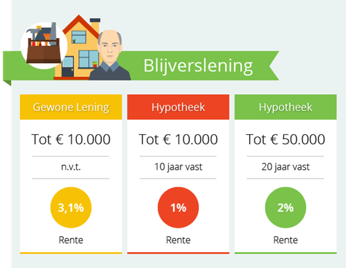 Het grootste voordeel van de blijverslening is de zeer lage hypotheekrente. Je betaalt als oudere de laagste hypotheekrente die er op dit moment te krijgen is. Slechts 1% voor bedragen tot € 10.000 en 2% voor bedragen van € 10.000 tot maximaal € 50.000. Die 2% staat dan ook nog eens 20 jaar vast.
