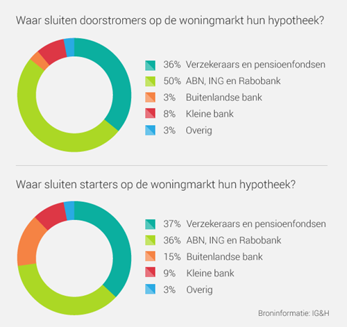 Een hypotheek van de bank is niet meer de norm. Minder dan de helft van alle hypotheken wordt afgesloten bij de Rabobank, ING of ABN Amro. Dat blijkt uit gegevens van onderzoeksbureau IG&H. Juist mensen die voor het eerst een huis kopen, laten de banken links liggen. Starters kiezen vaker voor verzekeraars en pensioenfondsen als geldverstrekkers voor hun huis.