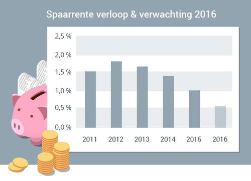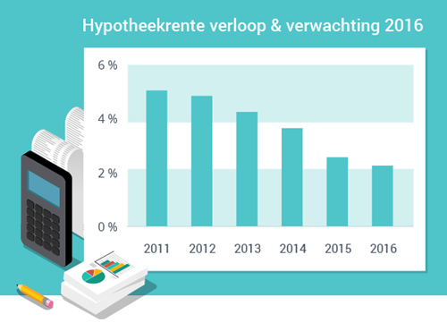 Wij verwachten dat de hypotheekrente in 2016 het huidige lage niveau houdt. Wellicht daalt deze zelfs nog een klein beetje.