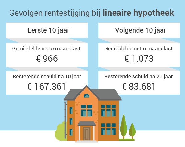 Marco en Babet sluiten in 2016 een hypotheek met een lineaire aflossing van € 250.000. De rente bedraagt 2,1 procent voor 10 jaar vast. Onderstaand de gevolgen van hun hypotheeksituatie als de rente over 10 jaar 5 procent bedraagt.