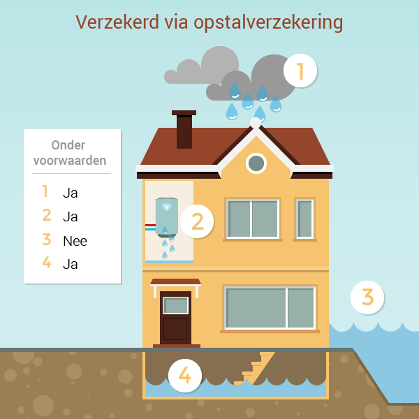 Je verzekeraar vraagt hoogstwaarschijnlijk om goed na te gaan hoe het water binnen is gekomen, want zeker niet alle schade is gedekt. Zo is de schade niet gedekt als water vanuit de grond in je kelder terechtkomt.