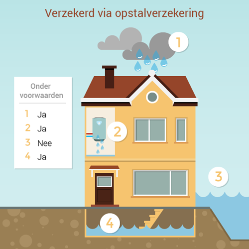 Je kelder is ondergelopen. De inboedelverzekering betaalt dan voor de spullen die er lagen. Zijn de muren ook beschadigd? Dan zijn de kosten voor de opstalverzekering of voor de verhuurder van je huis.