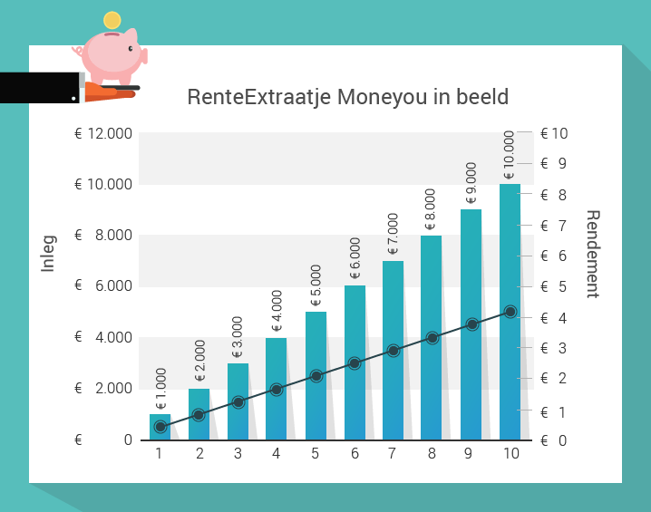 Je stort € 1.000 extra op je rekening en ontvangt van 17 juni tot en met 31 augustus 0,20% extra rente. Een jaar lang 0,20% extra rente levert je precies 2 euro op. Maar de actie loopt geen jaar. De actie loopt slechts tweeënhalve maand. Zo levert elke € 1.000 extra inleg bij MoneYou je precies 42 eurocent meer op dan normaal.