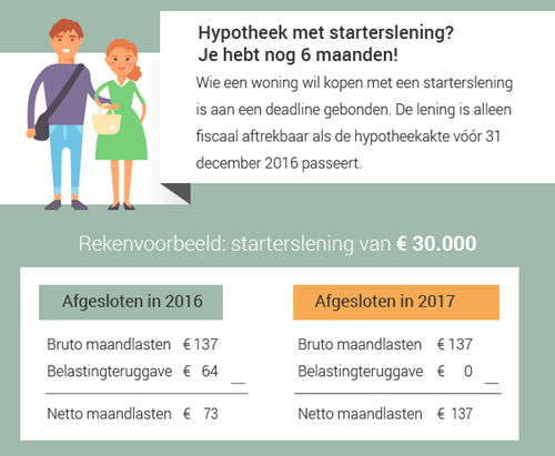 In eerste instantie is er een uitzondering gemaakt voor de starterslening. Leningen afgesloten in 2016 zijn nog fiscaal aftrekbaar. Je hebt nu dus nog maximaal zes maanden de tijd om je starterslening in orde te maken. Je hypotheekakte dient vóór 31 december 2016 bij de notaris gepasseerd te zijn. Passeert je hypotheekakte pas in 2017? Dan kun je nog wel gebruik maken van een starterslening, maar dan loop je het belastingvoordeel mis. En dat scheelt behoorlijk wat geld.