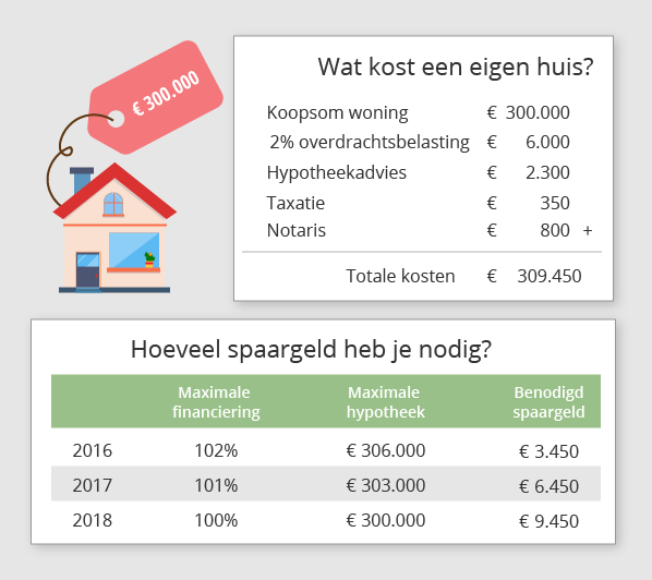 De maximale hypotheek daalt volgend jaar opnieuw met één procentpunt. Volgend jaar kun je maximaal 101 procent van de waarde van het huis lenen. Dat betekent dat je meer spaargeld mee moet nemen om bijvoorbeeld de overdrachtsbelasting en de notariskosten van te betalen. In 2018 daalt het maximumbedrag nog verder: dan kun je maximaal 100 procent lenen.