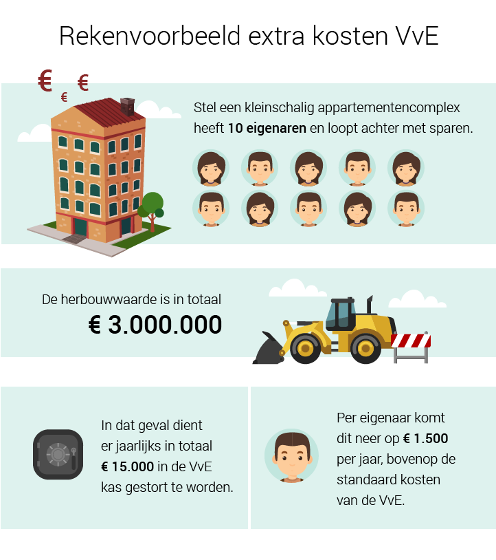 Stel een kleinschalig appartementencomplex heeft 10 eigenaren en loopt achter met sparen. De herbouwwaarde is in totaal 3 miljoen. In dat geval dient er jaarlijks in totaal € 15.000 in de VvE kas gestort te worden. Per eigenaar komt dit neer op € 1.500 per jaar, bovenop de standaard kosten van de VvE.