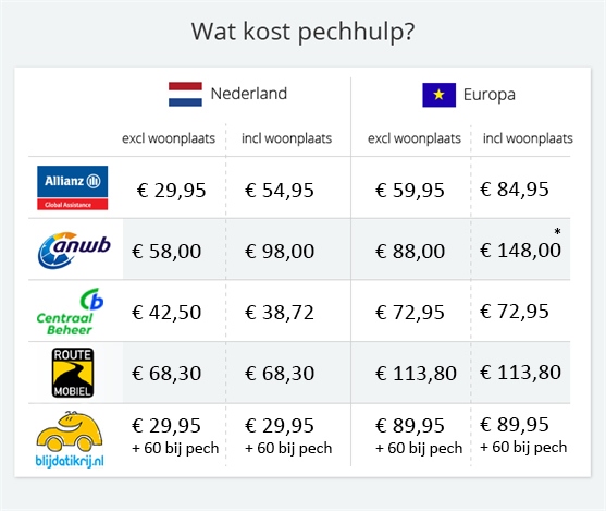 Kies je voor pechhulp met een service binnen Nederland, inclusief je eigen woonplaats, dan betaal je bij de duurste aanbieder € 98 per jaar. De goedkoopste service rekent € 38,72 per jaar. Ook op dekking in andere Europese landen kun je goed besparen op pechhulp. Onderstaande tarieven zijn gebaseerd op een nieuwe.