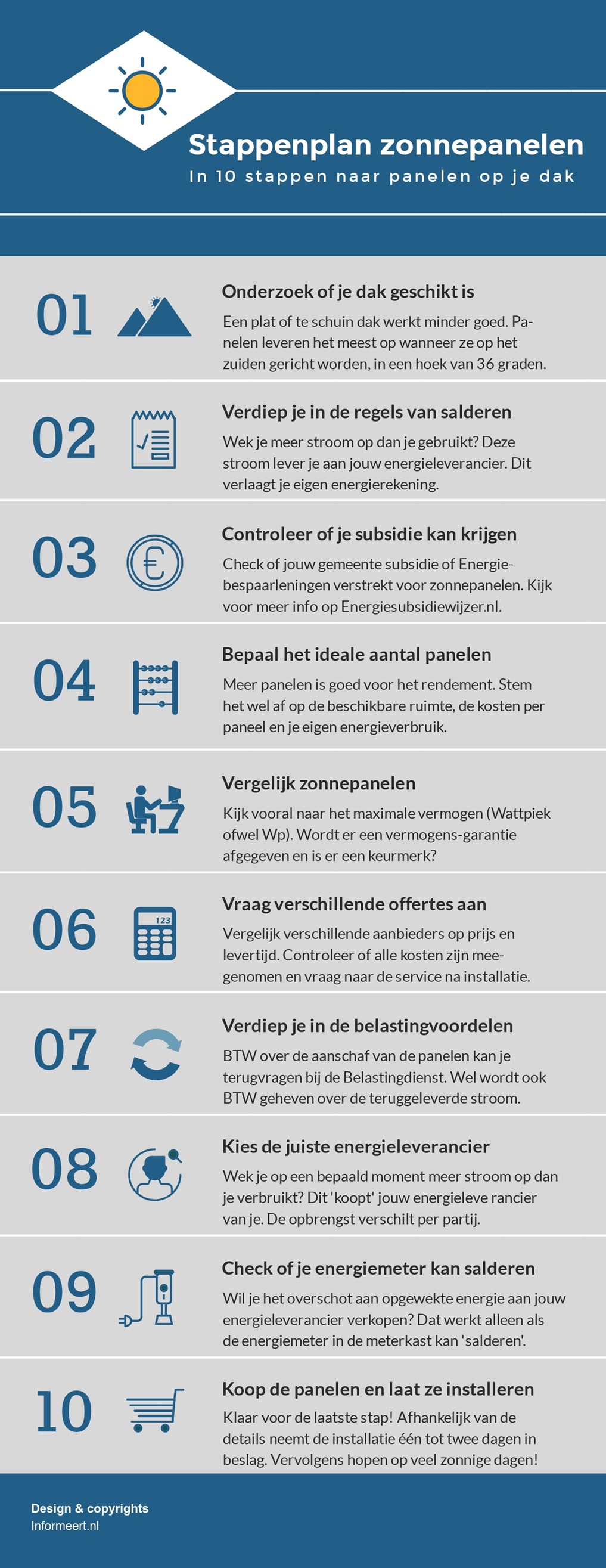 Het opwekken van stroom met zon, water of wind is niet het specialisme van Van Campen & Dijkstra. Vraag ons dan ook niet welk soort paneel jij het best op je dak kan leggen of wat de exacte opbrengst is van een bepaald type. Wel helpen we je graag op weg met de onderstaande infographic. Met het stappenplan bepaal je of de installatie van zonnepanelen iets voor jou is en hoe het aan te pakken.
