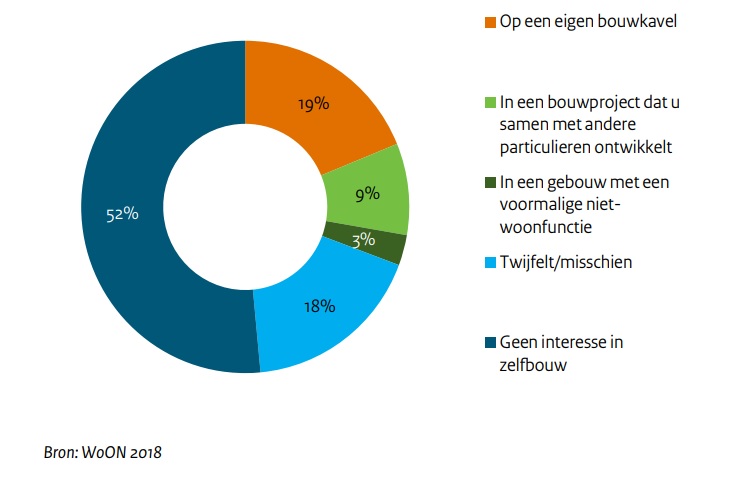 Bijna een derde (31%) van de huishoudens die de komende jaren willen verhuizen naar nieuwbouw, staat open voor het bouwen van een eigen woning. Een kleiner deel (18%) twijfelt. Dit blijkt uit het WoonOnderzoek over 2018, een jaarlijks door de overheid uitgevoerd onderzoek. In 2015 was 24 procent geïnteresseerd in zelfbouw, nu ligt de animo dus hoger.