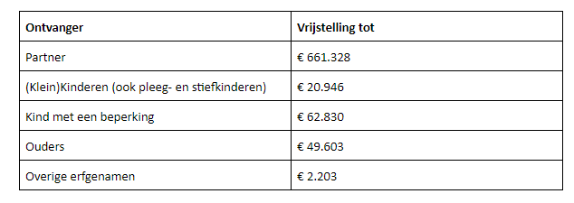Over een deel van je erfenis hoef je geen belasting te betalen (vrijstelling). De hoogte van de vrijstelling is afhankelijk van de verhouding tot de erflater. In 2020 is dit als volgt: