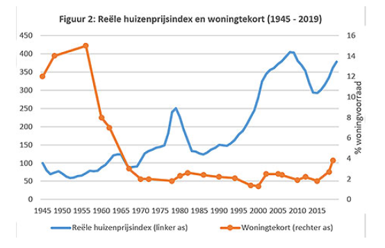 Bron: Woningtekort: BZK. Woningprijzen: OESO, CBS en tot 1970 de JST macrohistory database