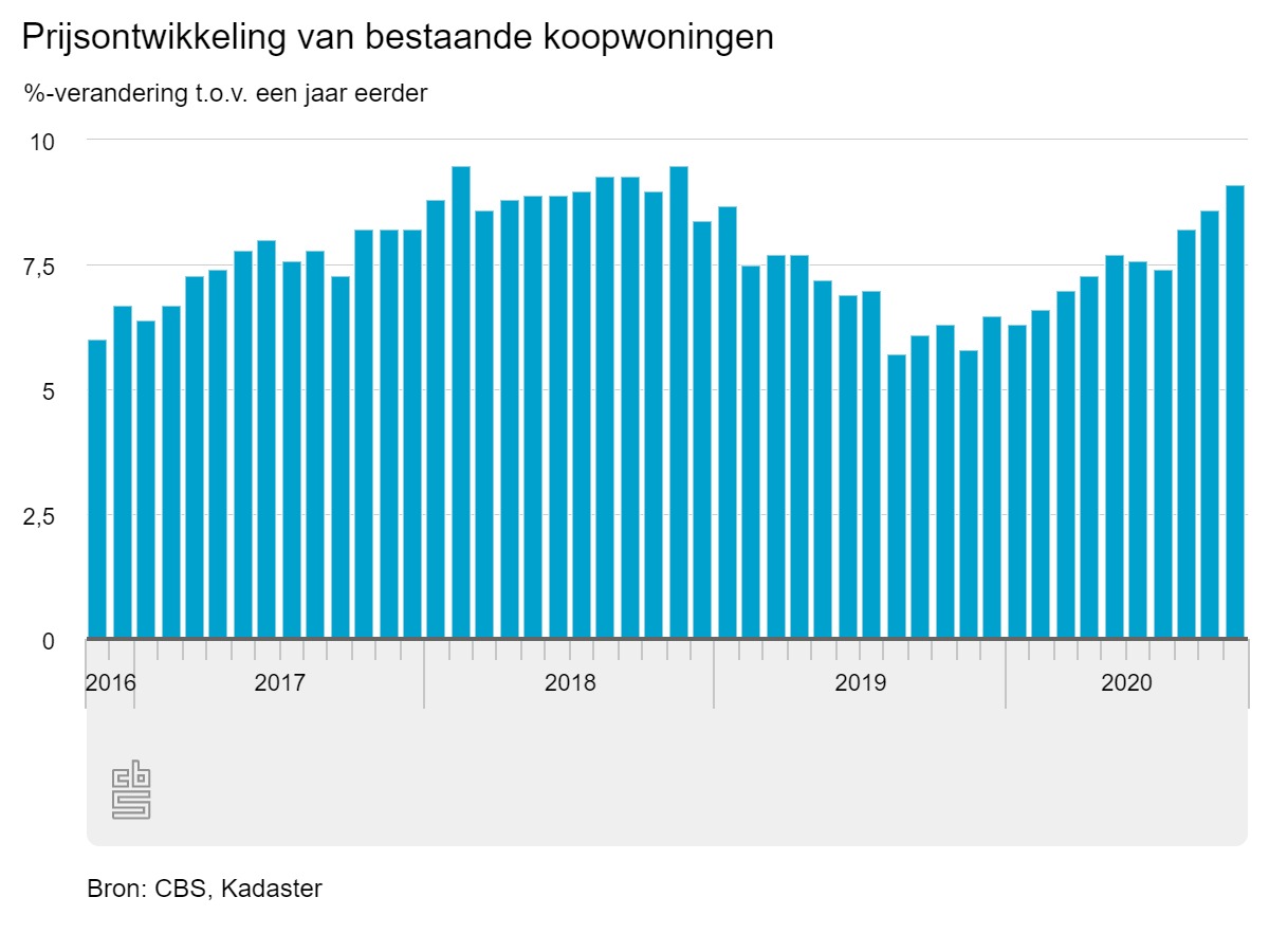 Bestaande koopwoningen waren in oktober 9,1 procent duurder dan in oktober 2019. Dat is de grootste prijsstijging in bijna twee jaar, zo meldt het CBS. Wie in oktober een woning kocht, betaalde gemiddeld €350.244. Wanneer we terug gaan naar het begin van dit jaar, wordt duidelijk dat de woningmarkt zich weinig aantrekt van de coronacrisis. Op dit moment geven huizenkopers gemiddeld €20.794 meer uit dan in januari. Wat kan je in de komende maanden verwachten?