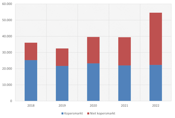 Bij hypotheekcijfers wordt onderscheid gemaakt in de kopersmarkt en de niet kopersmarkt. In de laatste categorie is het oversluiten van hypotheken een belangrijke factor. Daarnaast vragen veel huiseigenaren een tweede hypotheek aan, om daarmee een verbouwing of het verduurzamen van de woning te financieren. De niet-kopersmarkt was in 2021 voor het eerst groter dan de kopersmarkt.