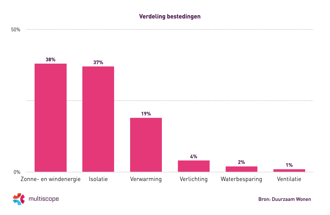 Zonne- en windenergie is de nipte winnaar als het gaat om bestedingen voor verduurzaming. Op een kleine afstand gevolgd door woningisolatie. Aan de productcategorieën verlichting, waterbesparing en ventilatie wordt relatief weinig uitgegeven. Reden hiervoor is dat mensen dit soort zaken vaak zelf oppakken en de kosten doorgaans beperkt zijn.