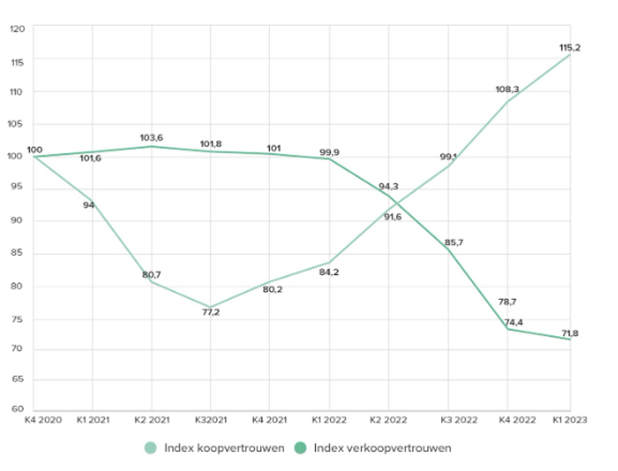 In vergelijking met het laatste kwartaal van 2022 is het koopvertrouwen met 6,9 procent toegenomen in het eerste kwartaal van dit jaar. Dit blijkt uit de Funda index. Het koopvertrouwen neemt al sinds het derde kwartaal van 2021 toe. Het verkoopvertrouwen is juist met 2,6 procent gedaald. Maar in vergelijking met eerdere kwartalen is deze daling relatief klein.