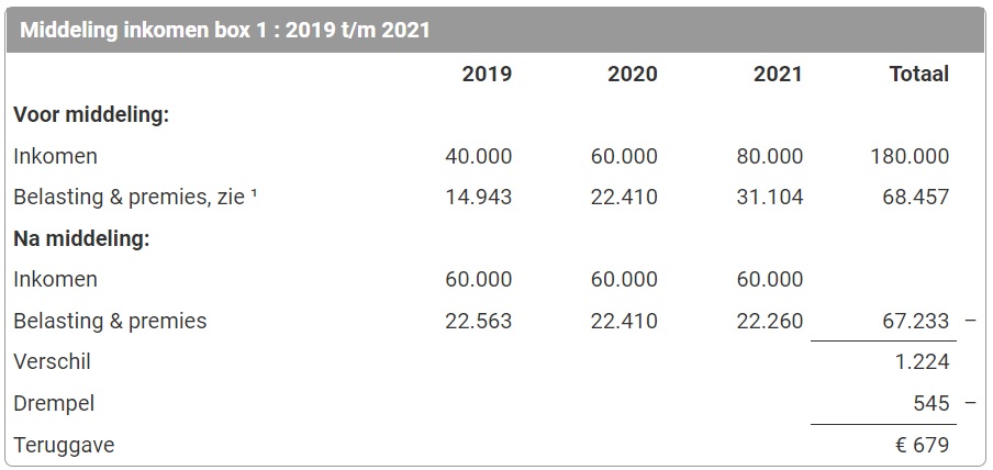 Met de middelingsregeling wordt naar het gemiddelde van drie opeenvolgende jaarinkomens gekeken. Verdiende jij achtereenvolgens € 40.000, € 60.000 en € 80.000 per jaar? Dan wordt het gemiddelde van die drie jaren (€ 60.000) het uitgangspunt voor de belasting. Vervolgens wordt naar het verschil gekeken tussen de betaalde belastingen. Het verschil boven de drempel van € 545 krijg je terug van de belastingdienst. Hieronder vind je een sterk versimpeld voorbeeld terug: