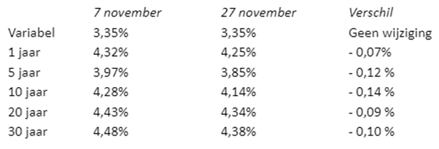 November gaat eindigen met een gemiddeld lagere hypotheekrente dan in het begin van de maand. Iets dat we lang niet meer gezien hebben. Het verschil in hypotheekrente is: